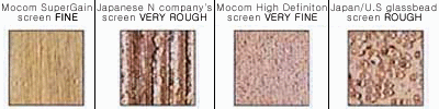 玻璃砂(glass bead) 屏幕是由玻璃做的圓珠制造的。玻璃砂屏幕的表面粒子度是150μm~75μm,這是相當于模擬映象的水平。但是Mocom高輝度屏幕是向注射線方向形成10 μm以下的散亂線,而且Mocom高質量解像度屏幕的表面粒子度是5μm以下的高精密表面粒子度,因此它是世界上唯一可以實現SXGA級以上QXGA級解像度的屏幕