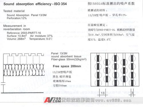 究其原因,這個(gè)房間6個(gè)面都是由混凝土、磚墻、大塊的玻璃等反射系數(shù)強(qiáng)烈的材質(zhì)構(gòu)成,要改善就得大量敷設(shè)吸聲和擴(kuò)散材料,幾經(jīng)周折,后來幸得軍內(nèi)某科研生產(chǎn)部門在技術(shù)上的大力支持,他們提供了國內(nèi)領(lǐng)先水平的聲學(xué)建材以及大量的技術(shù)參數(shù),幾經(jīng)分析和測試之后,最后決定用這種穿孔率為12%的13/3M型吸聲板來敷設(shè)4墻。