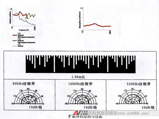 如果一個人在具有平坦側墻的矩型大廳中聽音樂,他聽到的聲音將是脆的,硬的或刺耳的,這種現象稱為頻率染色效應。QRD的反射體是一種不規則平面設計,目的是在反射中產生擴散,它產生的早期聲音非常豐富而圓潤,混響聲似乎是從許多方向-從側向,從頭頂以及前方到達聽眾的,可顯著地改善廳堂的音質條件。QRD擴散板是由一系列裂變深度的平行“藻井”組成,當聲波135度入射到水平放置的擴散板時,它就能在30度 ~150度之間以相等的強度將聲音反射出去。