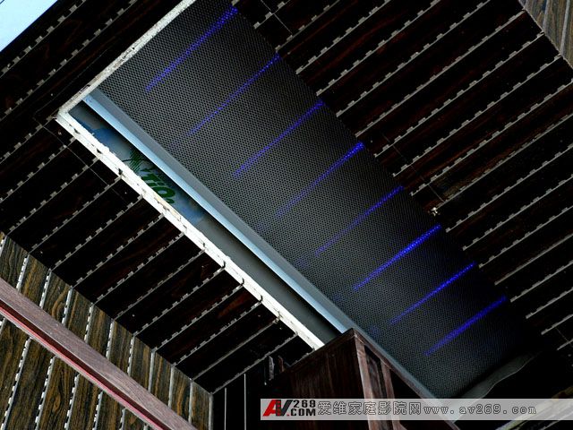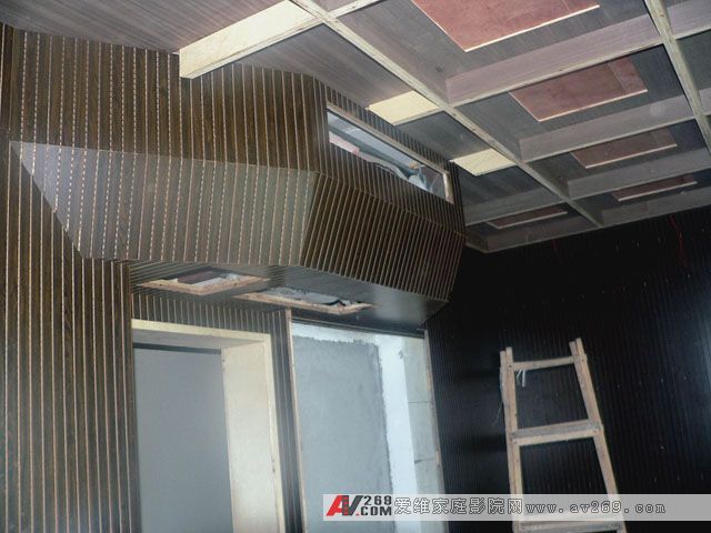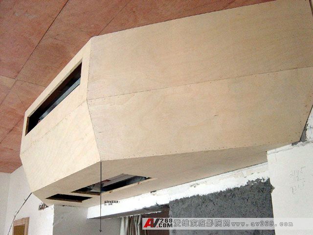 這個門口上方的中央空調風機盒原是由薄夾板做的,大聲壓時會引起共振雜音,將它拆掉,用厚夾板加13/3M型吸音板做了一個堅實的近弧型多面反射體,既消除了共振雜音,又希望它能散射改變56Hz的空間分布路徑,糾正室內頻響偏差。