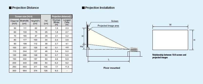 Screen size (16:9) Diagonal(inch) Projection distance (L)Width(W)(cm) Height(H)(cm)