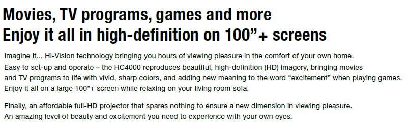 想象一下吧...高清晰度技術帶給您觀看自己的家庭影院時的舒適歡樂時光。易于安裝和操作 - 再現美麗的HC4000,高清晰度(HD)的圖像,使電影和電視節目以生動,鮮明的顏色的生活,并“興奮”的玩游戲。在客廳的沙發上放松你享受這一切在一個100“+的大屏幕上。最后,實惠的全高清投影機的備件,以確保沒有任何一個新的層面的視覺享受。一個美麗和興奮,你需要經歷與你自己的眼睛驚人的水平。