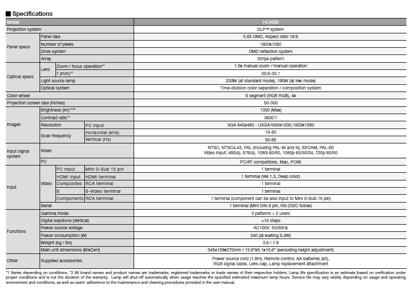 HC4000配備了6段式色輪再現于D65 (6.5 million)的標準色溫照明的能力。從視頻源的信號是轉載更真實貼近生活的色彩和更豐富的層次。