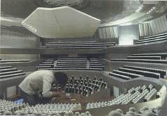 這個大廳不同用途時混響時間變化范圍在中頻是0.6s,從2.2s(演唱會),降至1.6s(爵士,激烈音樂)。后一種情況,在天花板上7個采光洞口會被打開,500平米的絲絨簾幕會在二層挑臺懸掛在管風琴前面。