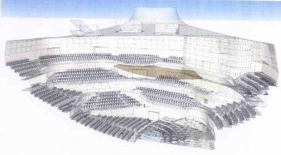 音樂家被觀眾在一個短的距離內包圍著,音樂包圍的親密感非常不同于長“鞋盒”式音樂廳。挑臺之下沒有觀眾,大廳給人以音樂殿堂的感受。葡萄園型音樂大廳內部不具備像鞋盒狀大廳內的側面反射墻,因此,這種漫反射是由包圍每組觀眾的平臺的反射弧墻面與欄板提供。彎曲形狀的座位后部(離地面的高度是1.2—1.3m)由多層板制成,同樣能夠有較大的空間感。
