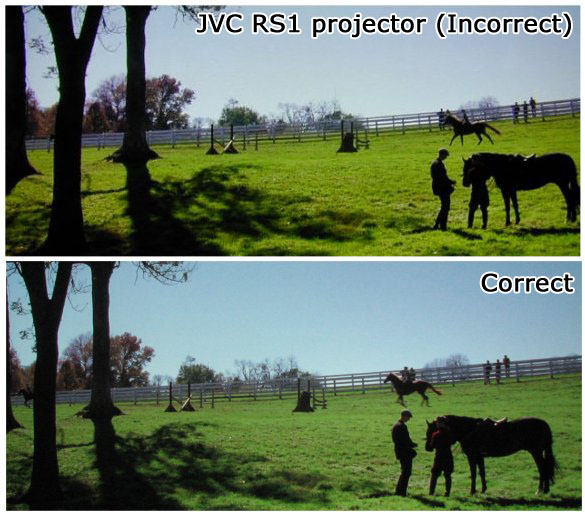 不幸地,答案是否定的。它沒有那樣地簡單。選擇電視/投影機設定選單中的6500K色溫選項是走在正確方向的一步,同時我們感謝提供這個選項的製造商。不幸地,這個選項在整個灰階的部份很少有接近正確值的地方。它也沒有考慮到其它搭配的設備(包含布幕)、或是電視或燈泡的老化與損耗。待會我們會看到色溫設定6500K,價值US$30,000 CRT (Barco Cine 8 Onyx)投影機灰階測量的細節,主要是告訴你它的值差多遠。對于你的顯示器,我們將會做相同的步驟,所以你自已可以看到你的顯示器的測量值也是差很多。然而現在我將要展示,從許多人認為是最好的顯示器材,非常貴的CRT投影機:US $40,000 Sony G90 CRT投影機上拍下來的校正前及校正后的屏攝: