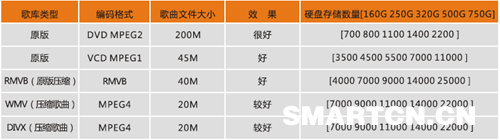 對一套點歌系統而言,歌曲庫是靈魂。不管用哪種方案,點歌系統曲庫的選擇都非常重要。目前常用的歌曲格式有:VCD、DVD、WMV、DIVX,以4分鐘的MTV為例,一首DVD歌曲占用硬盤空間為160M至200M;一首VCD歌曲占用硬盤空間為40M至50M;一首壓縮歌曲占用硬盤空間為20M至25M。具體參見下表: