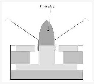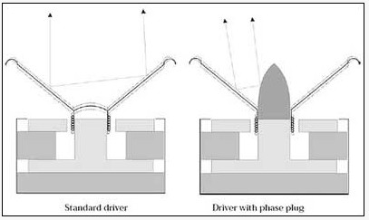 相位塞能避免普通防塵蓋分裂問題,并可幫助磁鐵系統的散熱,以承受更大的功率,同時也使音圈中的渦旋電流短路以降低失真。因此,除了鞏固振膜外,相位塞還可改善單元高端偏軸頻響擴散特性和改善音像表現,同時均衡振膜前面的氣壓,顯著地減少失真;另一優點是防止在分音點附近方向特性的突然改變,避免產生中音渲染。