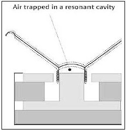 振膜在前后做活塞運動時,由此產生的聲波向外輻射形成聲音。然而,并不是所有的聲波都直接向外擴散,部分聲波將在振膜上經過交叉反射后才送至聆聽者的耳中。在下面的圖解中可以看到在左側振膜上產生的聲波反射路徑。在傳統的單元中,聲波將先被反射到另一邊再反射到聆聽者。由于這些聲波其實是在同一時間產生的但卻在不同時間聽到,這就形成了駐波失真。而相位塞能夠迅速的將二次反射波發射出去,減少了遲滯時間。因此,相位塞能夠有效的改善頻響特性,防止駐波和交越失真,使得偏軸頻響擴散特性和向軸頻響擴散特性更為平滑,避免出現多媒體音箱中經常出現的離軸頻響峰谷現象。