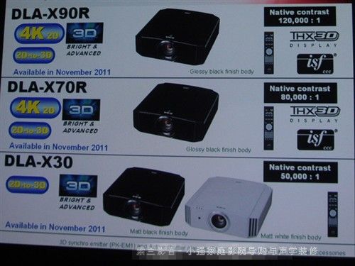 DLA-X90R、X70R是JVC與NHK共同開發的超高清晰度的投影機,采用e-Shift技術實現了3840×2160分辨率,其原生對比度分別達到12萬:1與8萬:1,而低端機型DLA-X30具備1920×1080分辨率與5萬:1原生對比度。
