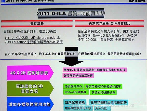 發(fā)表會一開始,JVC即以這張簡報說明其D-ILA技術(shù)在畫質(zhì)、功能的再進化升級。X90R與X70R的4K×2K超高解析度當(dāng)然是眾所矚目之焦點,而結(jié)合了全新純化柵欄光學(xué)引擎、更先進光圈機構(gòu)與新一代D-ILA元件,旗艦機X90R再次締造業(yè)界最高的120,000:1真實對比(去年X9為100,000:1)!針對一般3D投影亮度不足的詬病,JVC也以亮度全面提升50%來因應(yīng)。此外,2D轉(zhuǎn)3D、鏡頭記憶功能、銀幕調(diào)整模式再升級、更精細的三色收斂調(diào)整,以及更多簡易的3D調(diào)整功能與操作選單等,都彰顯新款DLA系列更為超值。