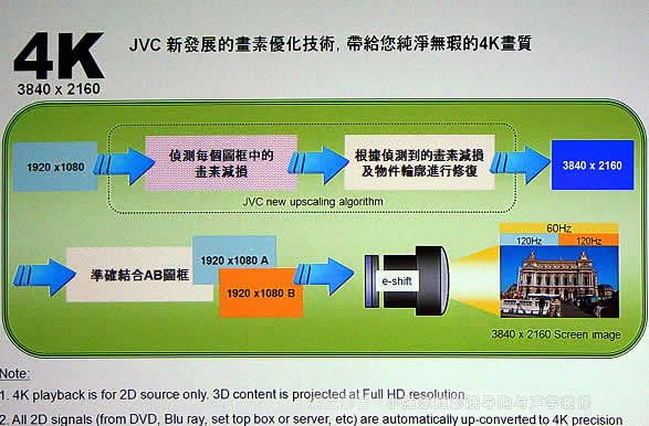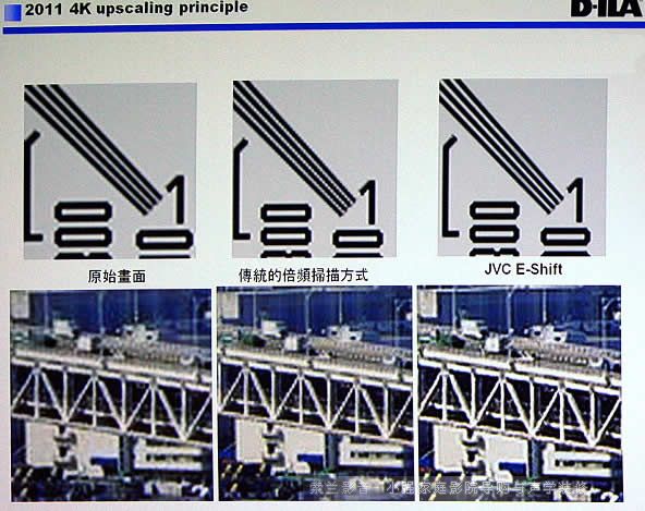 JVC早在2004年就發(fā)布專業(yè)用的4K2K D-ILA投影機,就連8K4K投影機在2008年也已公開展示,現(xiàn)階段推出4K2K家用投影機對JVC而言,在技術(shù)上并沒有困難之處;只不過當(dāng)前無論數(shù)位電視廣播或BD藍光光碟,都僅僅對應(yīng)Full HD 1,920×1,080(也就是2K1K)解析度,此刻推出真實解析度達4K2K的家用投影機,不僅要面臨幾乎沒有軟體可播放的窘境,也不會是符合市場實際需要的商品。但為了因應(yīng)高階影音玩家對更高畫質(zhì)的期待,JVC為X90R與X70R研發(fā)了稱為「4K e-Shift」的畫素優(yōu)化技術(shù),可將2K影像處理為4K超高解析度畫質(zhì),這可就非常吸引人了。