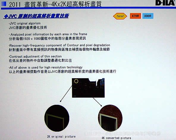 投影機技術(shù)領(lǐng)導(dǎo)品牌之一的日本JVC,日前於臺北舉辦家用投影機發(fā)表會,讓媒體與經(jīng)銷商親身體驗JVC最新款3D Full HD投影機的高超畫質(zhì)。包括全球首部可將2K影像上轉(zhuǎn)4K的超高畫質(zhì)投影機DLA-X90R與DLA-X70R,以及比上一代畫質(zhì)及性能更佳、定價卻更便宜的DLA-X30。以色彩濃郁、對比鮮明、可以輕鬆表現(xiàn)極純黑色著稱的JVC,對自家新品的信心,完全表現(xiàn)在示范片段上。除了《怪獸電力公司》外,舉凡《星際大戰(zhàn)三部曲:西斯大帝的復(fù)仇》、《蝙蝠俠:黑暗騎士》、《阿凡達》或《貓頭鷹守護神》,所使用無一不是黑暗場景片段,這對一般暗部細節(jié)表現(xiàn)不佳的投影機而言簡直是自尋死路,但JVC不愧是JVC,一上陣演出就艷驚四座,難怪臺灣最著名的影音達人士林曹醫(yī)師多年來一直是JVC投影機愛用者。到底新款JVC投影運用了什麼嶄新技術(shù)?又有怎樣的驚人畫質(zhì)表現(xiàn)呢?以下就為大家詳盡剖析。