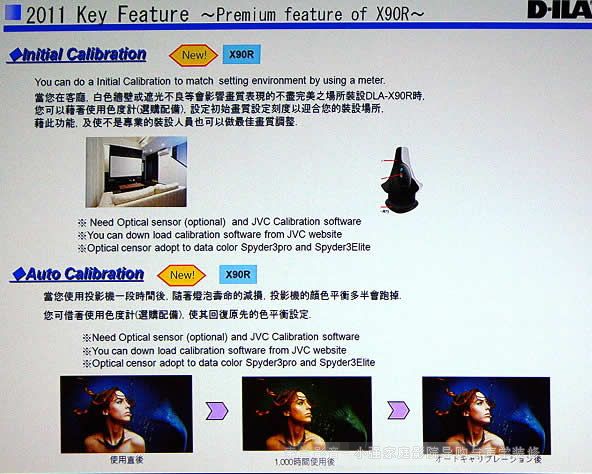 我們再回頭來看看X90R新增特異功能,配合另外選購的色度計就可讓畫質(zhì)表現(xiàn)更好。包括非專業(yè)視聽室遮光不良或白色墻面的反光,都可以色度計偵測環(huán)境條件作最佳畫質(zhì)調(diào)整。其次,當(dāng)投影機使用一段時間(例如1,000小時)以后,由於燈泡老化及亮度衰減,會使得投影機出廠設(shè)定的色彩平衡跑掉,此時X90R可利用色度計輕鬆回復(fù)原本正確的色彩平衡設(shè)定。小強家庭影院導(dǎo)購網(wǎng)歡迎您!www.2008wb.com
