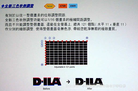 追求影像表現(xiàn)的極致,除了明暗對比、色彩階調(diào)的推升之外,三原色匯聚的精準也很重要。X70R與X90R都配備全新三色收斂精細調(diào)整功能,全銀幕平均切割為121點(水平11×垂直11)都可各自作精細達1/16個畫素的微調(diào),讓紅、綠、藍三色在畫面的每個區(qū)域都精準匯集,物件邊緣沒有任何色滲現(xiàn)象,自然可使整體畫面顯得更為精細。