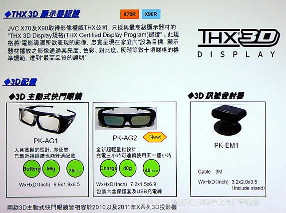 3D影像是當(dāng)前投影機最熱門的話題,去年前一代機種JVC就以全系列導(dǎo)入3D對應(yīng)能力,今年新機種的3D表現(xiàn)當(dāng)然更進一步,不但所配置的第二代3D眼鏡PK-AG2輕量化,改為充電式的設(shè)計也更為環(huán)保便利(充電3小時就可連續(xù)使用50小時)。此外,較高階的X70R與X90R還取得THX公司的THX 3D Display畫質(zhì)認證,通過亮度、色彩、對比度及灰階等數(shù)十項嚴格規(guī)范標準檢測,可確實將電影導(dǎo)演所欲表現(xiàn)的畫質(zhì),忠實地在家庭電影院重現(xiàn),這是對X70R與X90R畫質(zhì)的另一項肯定與保證。[page]