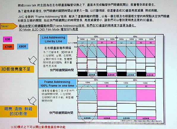 去年可說是各品牌投影機推出Full HD 3D投影機的元年,經(jīng)過一年的市場銷售,3D影像亮度不足是消費者最普遍的反應(yīng)。為此,JVC此次新款投影機就將3D影像的亮度提昇,列為重要的性能增進目標之一。JVC表示先前為了打斷左右眼的串影現(xiàn)象,主動式3D眼鏡的左右眼必須交互關(guān)閉,整體而言關(guān)閉時間達50%,導(dǎo)致畫面亮度大幅衰減。今年JVC新款3D投影機透過「Frame Addressing」技術(shù),以整個圖框交替來決定快門眼睛開關(guān),也就是以左眼開、右眼開的頻率作動,3D模式時比2D D65的Film Mode增加50%亮度,有效達成明亮、清晰、鮮艷的3D影像表現(xiàn)。小強家庭影院導(dǎo)購網(wǎng)歡迎您!www.2008wb.com