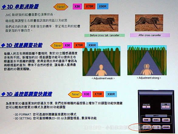 此外,為了提供更優(yōu)異舒適的3D影像體驗,JVC還開發(fā)了數(shù)項3D相關(guān)新技術(shù),包括:可大幅改善串影現(xiàn)象的「3D串影消除器」、可調(diào)整左右眼畫面水平距離的「3D視差調(diào)整功能」與可快速切換模式與設(shè)定的「3D遙控器調(diào)整快捷鍵」。