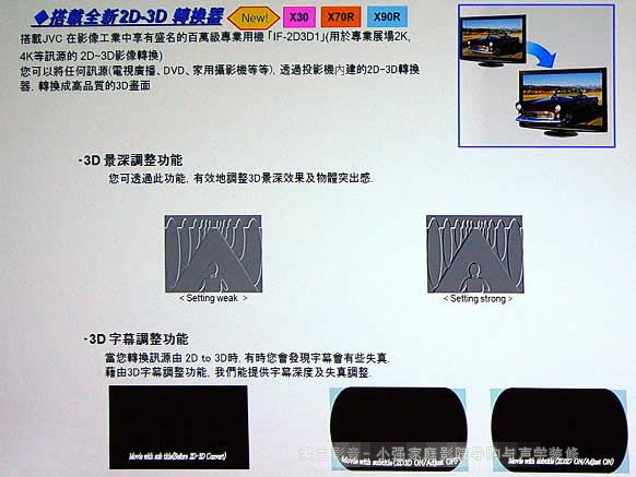 另一方面,全系列新機也新搭載了「2D-3D轉(zhuǎn)換器」,此功能源自JVC百萬元級的專業(yè)2K及4K訊源2D-3D影像轉(zhuǎn)換器IF-2D3D1,將其核心轉(zhuǎn)換電路移植到X30、X70R與X90R上頭,可將電視廣播、DVD與家用攝影機拍攝的2D影像,都轉(zhuǎn)換為3D畫面效果。