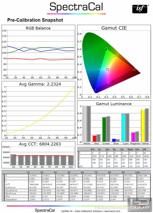 這張圖是小弟在關於色彩的各個選項中,組合出最接近HDTV標準的設定,色溫設定在D65的檔位,色域在EBU色域,GAMMA選擇標準,PURE COLOR關掉,其於皆預設值下的量測結果。