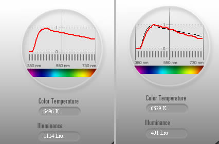 這個部份還是採用小弟發明的閃燈量測法,第一張圖是 Nikon SB-80閃燈的光譜分佈圖,第二張是經過眼鏡在同步狀況下拍出來的光譜圖,我們可以看出透光率約在35%左右,同時光譜分佈跟原光譜相當接近,并沒有造成很大的色偏。
