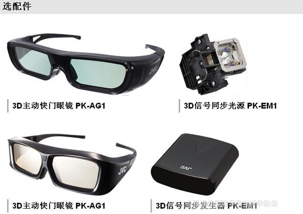 在DLA-XC980、DLA-XC780和DLA-XC380觀看3D圖像需要配合3D快門眼鏡(PK-AG1)和3D信號同步發生器(PK-EM1)。3D視頻軟件(3D媒體或3D三維廣播內容)和兼容3D的視頻播放器放也是必需的。