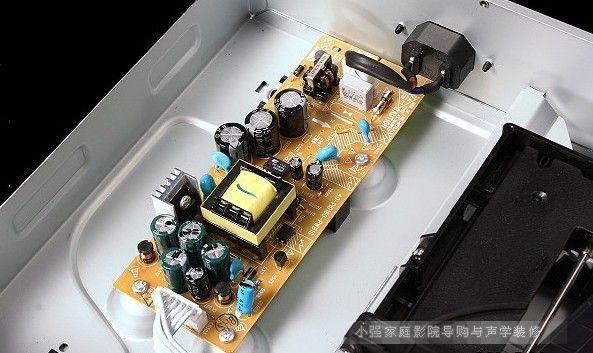我們現在所看到的,其實只是BDP-LX55「內層」機箱,在其底部Pioneer另外還加了一層金屬底板做成復合結構。此外,內層機箱底板也非平面,而是壓製成高高低低的結構以增強剛性。照片正中央長方形電路板是BDP-LX55的電源供應,請注意它是鎖固在底板四個凸起的半球形結構上,為的是隔絕彼此間震動之傳遞。