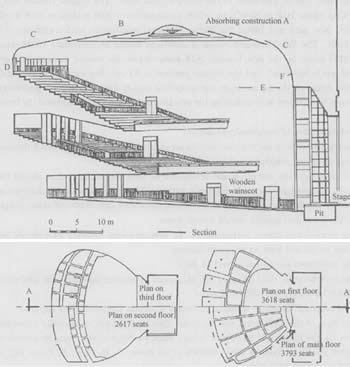 浮雕頂棚只是大劇院聲學“竅門”中的一個,建筑聲學的精巧設計,處處可見。歌劇院室內看上去是橢圓形的,但觀眾眼鏡看到的形狀卻是個“假相”。負責大劇院室內音質測試的清華大學建筑學院建筑物理實驗室燕翔教授介紹說,從視覺美觀上講,弧形墻面的橢圓劇場,會更加美觀,但圓弧形對于音質來說卻是致命的。長方的體型有利于反射聲音,音質最好,但看上去又會古板。最后,設計師使用了一個兩全其美的辦法。