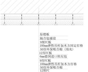 我們采用彈性吊頂,雙結構鋪設隔音氈9mmFC板,100mm彈性吊桿加木方固定打格,50mm環保吸音棉填充,滿鋪12厘FC板9FC板,夾6厘進口阻尼氈。為了增加隔聲量,我們設計了雙層復合結構,中間添加空氣層,在有限的高度內做到了最大化的隔聲量設計。