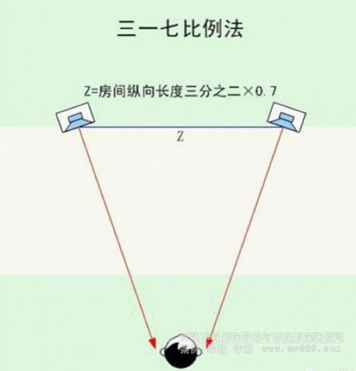 效果:此法亦用于尺寸較大、比例均勻的空間。它與「三一七比例法」的精神是一致的,唯一與「三一七比例法」不同的是二音箱之間的間隔較窄。此法亦可得到平衡的聲音與寬深的音場。