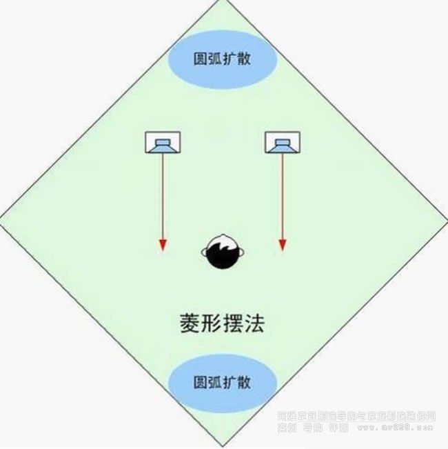 擺法:此法只限正方形空間使用。將正方形空間視為菱形,音箱擺在菱形二邊靠墻處。音箱后面的菱形尖角與聆聽位置后面的菱形尖角要做圓弧或圓柱聲波擴散處理,二音箱不宜靠側墻太近。