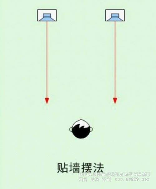 擺法:這是最古老的擺法。將音箱貼近后墻擺,不論是距離后墻50公分或30公分、20公分都沒關系,自己去調配即可。通常音箱不需要向內投射角度。