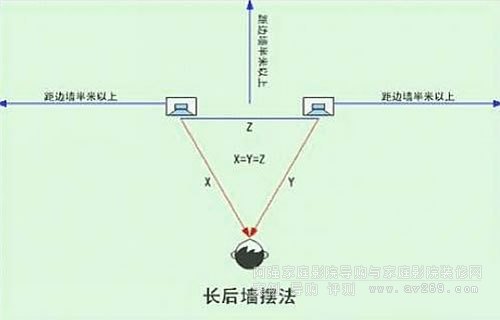 擺法:在一個長方形的房間里,一般玩音響的經驗,都會以短邊為音箱的后墻。但這個“長后墻擺法”卻反其道而行,把長邊為音箱后墻。音箱要離開後墻起碼要1米以上,而音箱與側墻的距離起碼要半米以上。兩個音箱之間的距離與聆聽者的位置畫等成一個正三角形,兩個音箱的向內拗投射角度也要起碼45度以上。聆聽位置不可貼墻,至少要留一米的距離。