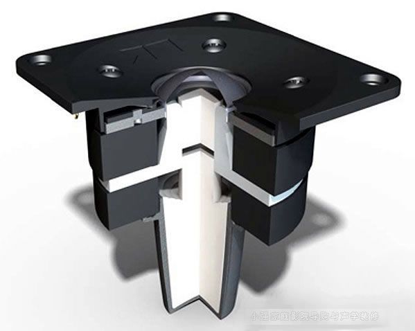 MK這項發明由於隱藏在音箱內部,知道的音響迷并不多。先前運用三高音陣列已大幅提升喇叭高音頻段的表現,但MK并不以此自滿,轉而研究如何提升「單一高音單體」的音質。MK發現傳統高音單體框架在振膜后方近處就密合起來,振膜向后方發射的聲波反射之后,其實會影響到振膜向前移動發聲的純度(也就是我們聆聽到的高音混合了振膜背波反射回來的聲音)。如何解決呢?MK在高音振膜后方加上一條細長的導管,管徑與長度都經過精密計算,如此一來高音振膜的背波就可沿著導管傳輸發散、不會反射回去拍打振膜。MK在1992年推出業界第一款線性傳輸(導管式)高音單體S-5000,之后有不少知名Hi-End廠家跟進推出類似結構的單體,MK自己也持續改良提升。歡迎光臨小強家庭影院導購網