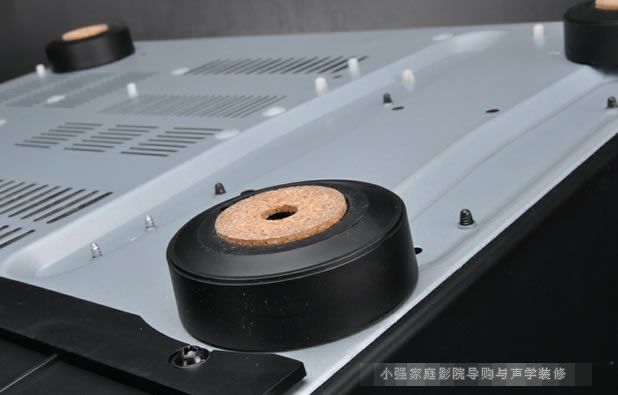 本機底部的四顆圓形角墊除了採用加大厚實的設計,中央也設有高摩擦力的軟墊,讓擴大機擺放時更為穩固。