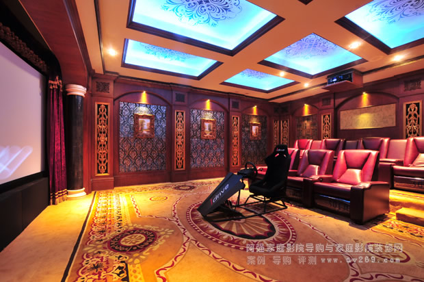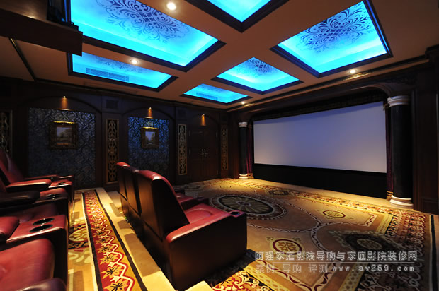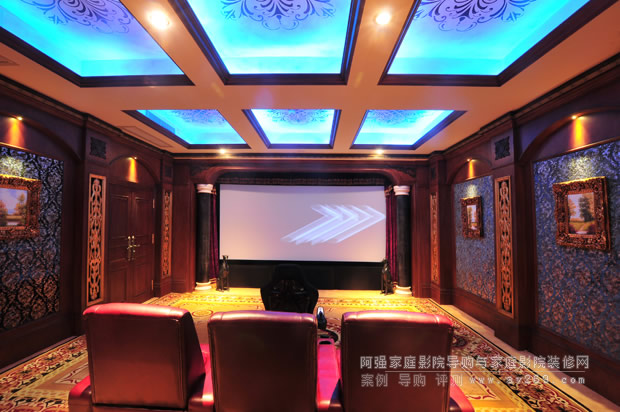 整體面積50平米,設計風格歐式古典風格。整體感覺金碧輝煌。傳統的墻板加軟包的設計,傳統中隱藏的聲學處理模塊的應用。布料使用比利時進口雪尼爾絨布料。描金的角線是后期手繪上去的。天花板的設計是該影院視聽室中最壯麗的部分。歐式設計中最重視天花的設計。這樣的天花設計靈感來自于古老的十八世紀的歐式嵌線圖案,在3D處理中幾個翻模變為有強烈立體感的現代創意。雖然施工的工藝很復雜成本不菲,但業主需要的是效果。這樣的復雜造型對聲學擴散要比一般的聲學擴散體好很多。