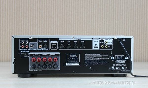 作為一臺次世代功放,1713配備電視機(jī)頂盒、藍(lán)光高清、游戲與網(wǎng)絡(luò)四路HDMI輸入端,支持藍(lán)光和3D訊源的解碼,符合現(xiàn)在的影音潮流趨勢。獨(dú)立配備同軸和光纖兩個S/PDIF規(guī)范的數(shù)字音頻輸入接口,適用于各種數(shù)字音源的接入。功放五聲道輸出,超重低音另設(shè)一路數(shù)字端口。從設(shè)置的接口來看,還是比較符合1713的自身定位,遵循一種實(shí)用至上原則,對于大部分的日常娛樂應(yīng)用都能輕松應(yīng)付。