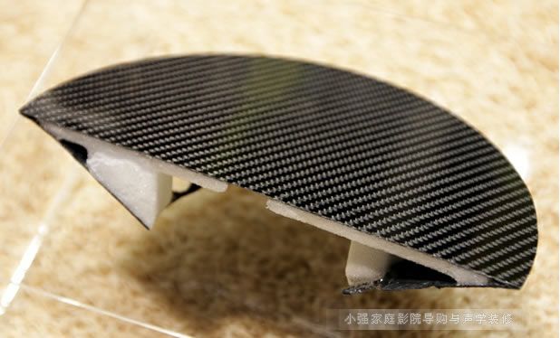 這項技術全部集成于曲線完美的箱體內,箱體材料與超高性能汽車所用的碳纖維和巴沙木復合材料相同。之所以采用這種材料是因它具有超輕和堅硬的特性。箱體的拋物線形狀增加了箱體的強度,這意味著聲音完全來自于驅動單元的運動,絕不受箱體的影響。