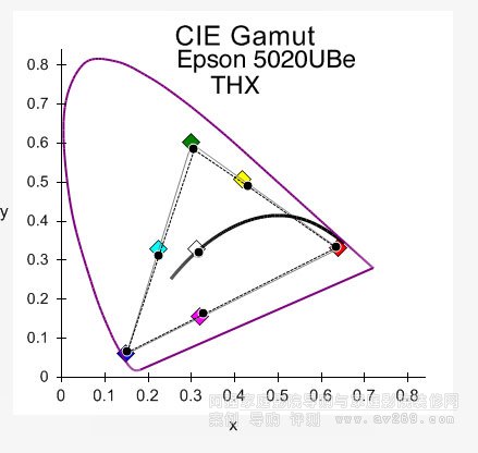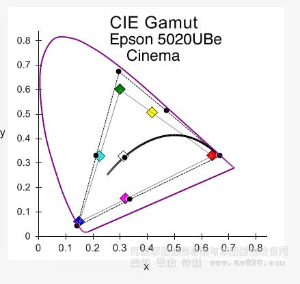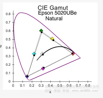 注意THX和Natural具有幾乎相同的色域圖,而實際上其測試值也非常相似。區別在于Natural模式有更多一些“pop”(注:可以理解為高對比度、高飽和度所帶來的出屏感,即畫面有力),并且就白平衡、對比度,以及銀幕的總體觀感而言,和Cinema模式很相似。一些人會因為這個原因而喜愛Natural模式甚于Cinema模式。Cinema模式的擴展的色域是見仁見智的東西,有些人會喜歡而另一些人則不會。除了色域的偏移,Cinema和Natural大體上是等同的。