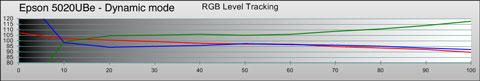 Dynamic模式,正如早前提到過的,為了增強亮度輸出而加強了綠色。因此,其RGB電平看上去有點不穩,尤其向純白方向移動時。