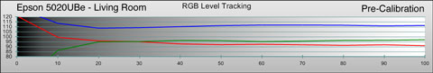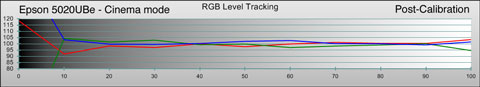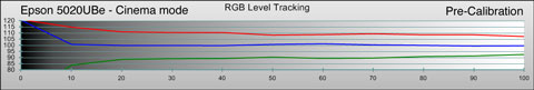 在Cinema模式下,投影機出廠設置測得大約6000K,但一點微調就能輕易地將投影機抬升到6500K。以下是校準前和校準后的Cinema模式的RGB電平值,以及我們的校準值: