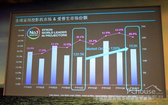 愛普生(中國)有限公司大中華區家用機銷售經理中田一平先生,帶來了家用投影機全球市場分析的報告,并對中國市場做了期待。中田先生指出,相比2011年第一季度,2012年第一季度全球家用投影機市場容量增長了126%,而愛普生的市場占有率從39.4%增長到了40.8%,其中在日本市場占有率更是達到了84%。