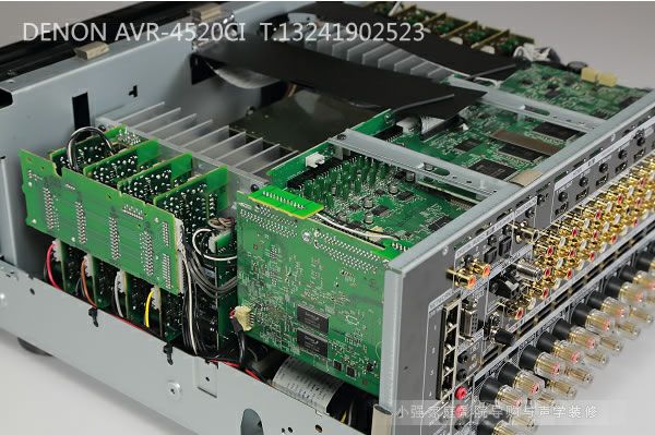 兩側散熱片旁排列了9組獨立功率放大模組,讓AVR-4520CI在8歐姆負載條件下,每聲道可提供150瓦輸出功率。