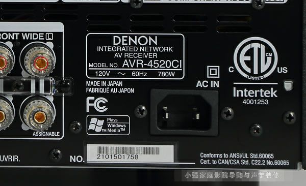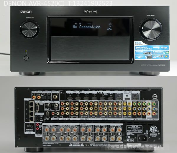 身為旗艦機種,AVR-4520CI搭載D.D.S.C-HD 32(Dynamic Discrete Surround Circuit)動態分離環繞電路技術,是Denon旗下第一部具備32位元數位音訊處理,以及D/A轉換的AV環繞擴大機,使用5顆Burr-Brown PCM1795數類轉換晶片,最高支援32bit/192kHz的高解析規格。 值得注意的是,背板左上方有一個「Denon Link HD」端子,可接收來自藍光機的主時鐘訊號,整個傳輸、數類轉換過程都由單一主時鐘負責,有助於降低時基誤差,但必須搭配同洋具備「Denon Link HD」的藍光機才能發揮功效,不過這次代理商送來搭配的藍光機DBT-1713UD沒有此項功能,想要擁有「Denon Link HD」的話,記得改選另一款等級更高的新機DBT-3313UD。