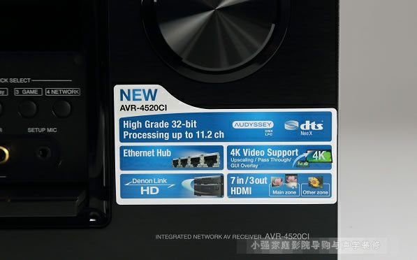 去年10月份才在美國正式上市的Denon AVR-4520CI,原廠將其定位為旗艦等級的 AV環繞擴大機,擁有9.2聲道輸出能力,可外接兩顆主動式超低音,創造豐沛的低頻能量。功率放大的部份,承襲了自家旗艦10聲道后級POA-A1HD的設計,打開機箱細看兩側散熱片旁排列了9組獨立功率放大模組,讓AVR-4520CI在8歐姆負載條件下,每聲道可提供150瓦輸出功率,負載下降至6歐姆時,功率則提升至190瓦。將來想要再增加聲道數,本機內建DTS Neo:X環繞解碼功能,透過Pre Out前級輸出外接一臺兩聲道擴大機,即可提升至11.2聲道。另外,原廠將電源供應器配置在機身中央偏前方的位置,據說可以平衡機身重量并降低諧振,也是追求Hi End好聲的做法。