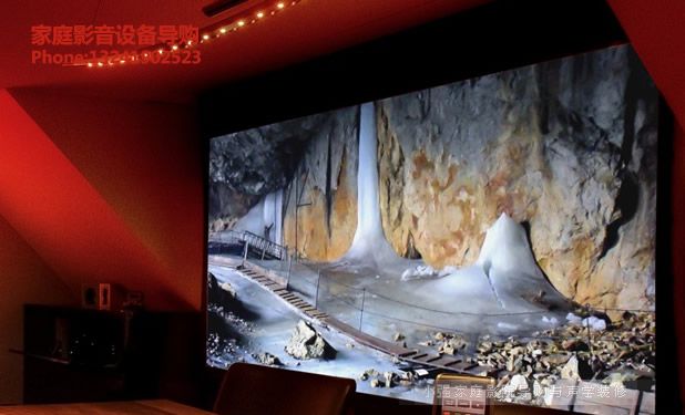 前墻的幕布處理非常大膽,畫面占滿整個墻體,兩角均有倒三角,這是房間固有的結構如果沒有他我們可以上更大一些的畫面了。
