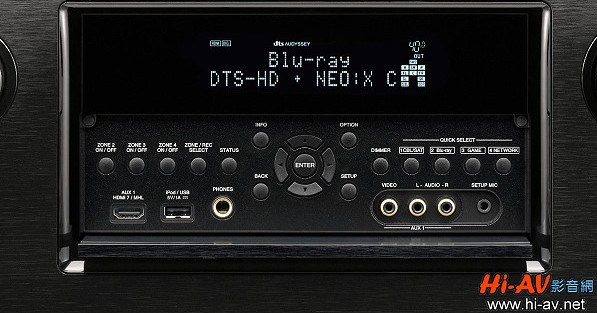 打開蓋板,正中央是十字方向鍵與輸入鍵的多功能操作組合,上部左右兩側分別為多區及訊源快速選擇切換,左下角有HDMI輸入、對應iPod可充電的USB端子與耳機輸出插孔,右下角則有一組同軸影音輸入與Audyssey音場測試麥克風插孔。左下角這組HDMI端子除了方便連結游戲機、數位相機之外,也支援新款Android智慧型手機的MHL連接,可將手機內的影音檔案送至本機在整套AV系統播放。