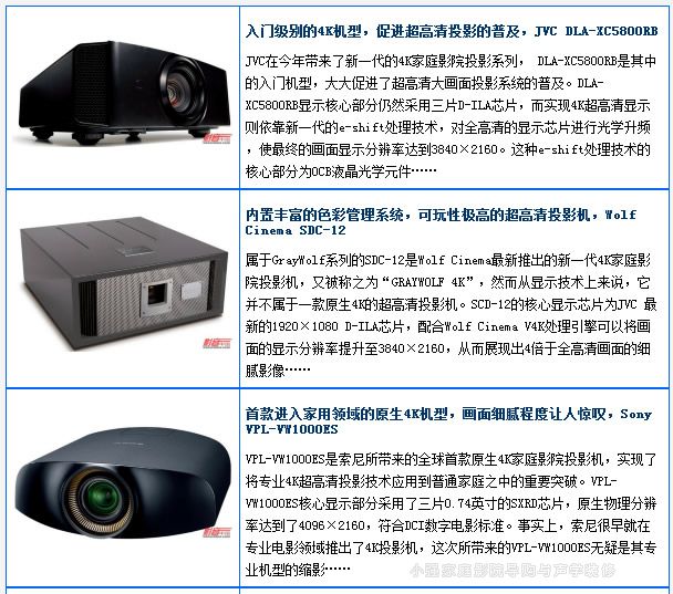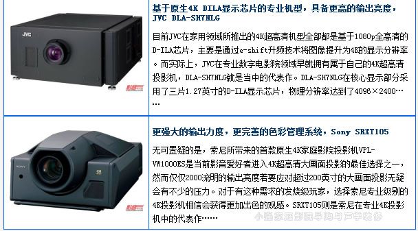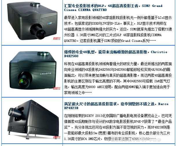 由此看來,4K超高清家庭投影機的選擇已經從剛開始單純的LCoS機型(包括索尼的SXRD與JVC的D-ILA),延伸到高端的三片式DLP機型。而這些頂級的DLP機型除了高昂的價格之外,最重要的特點就是匯聚了不少專業4K投影機的領先技術,專業味濃郁,整體畫面的表現及應用范圍要比常規的4K家用機型更為出眾。換個角度來看,如果資金充裕的頂級玩家,搭載較低輸出亮度的專業4K數字電影投影機也是一個不錯的選擇。因此,下面除了為大家集中分析上面幾款4K家庭影院投影機的技術特點與優勢之外,還帶來多款熱門的4K專業投影機的綜合介紹,帶來更加全面的4K超高清投影機縱覽。