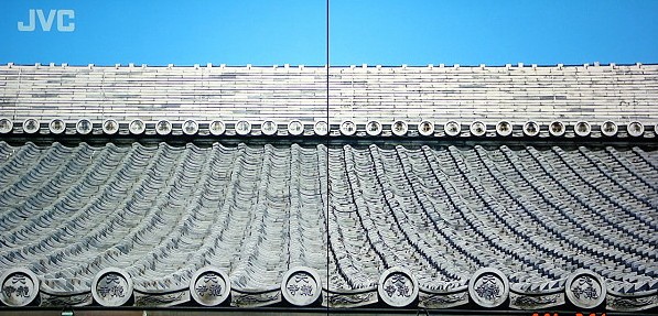 日本京都天龍寺屋瓦的特寫鏡頭,整個屋頂?shù)氖芄馐呛芫鶆虻模沟糜山吝h整片屋頂?shù)奈萃呦袷沁B成一片。但看看右半部經(jīng)BDP-103D內(nèi)建Darbee處理之后的畫面,每一片屋瓦邊緣的線條明晰許多、明暗的范圍拉開了、深淺的階調(diào)也更豐富,這使得層層疊疊的每片屋瓦變得非常分明,也讓2D平面的影像有了類似3D的景深感。