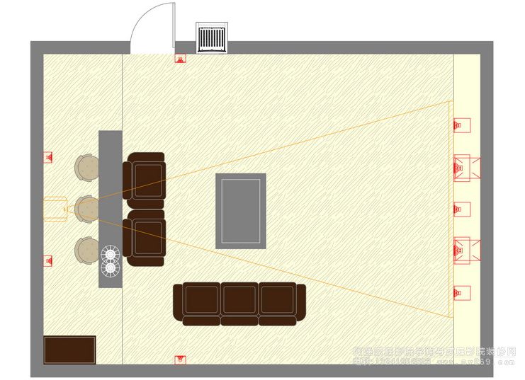 整個房間在沒有建設之前還是比較大的,大概有36個平米還多,但是前墻要放置非常多只喇叭,5只S150加2只卡拉OK喇叭加2只超低音喇叭,一共9只揚聲器要放在幕布后面,所以幕布后面隔掉了1米寬的空間,然后四周墻面也要做一些吸引結構,所以最后完成以后的房間大小在30平米不到一些。